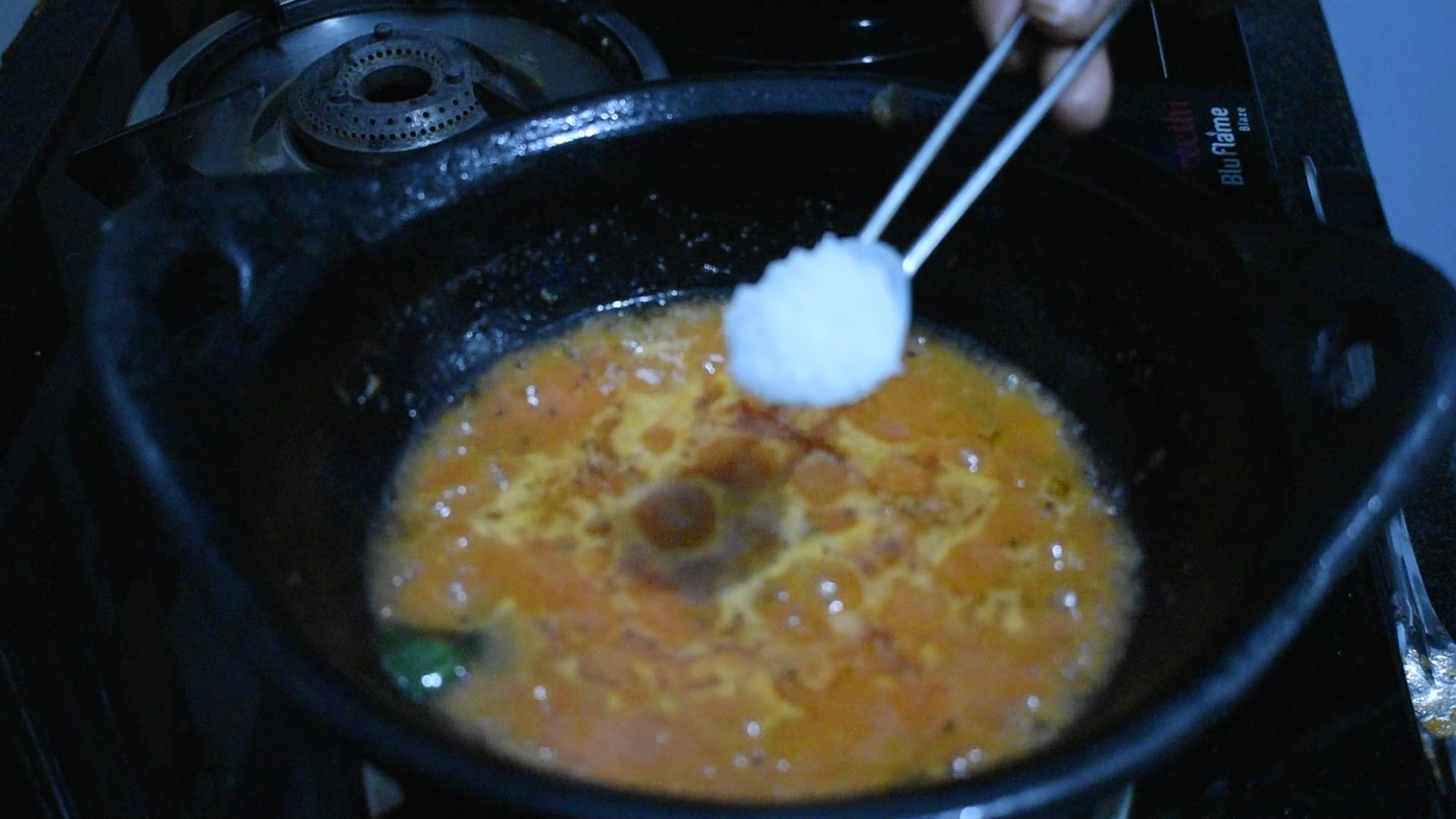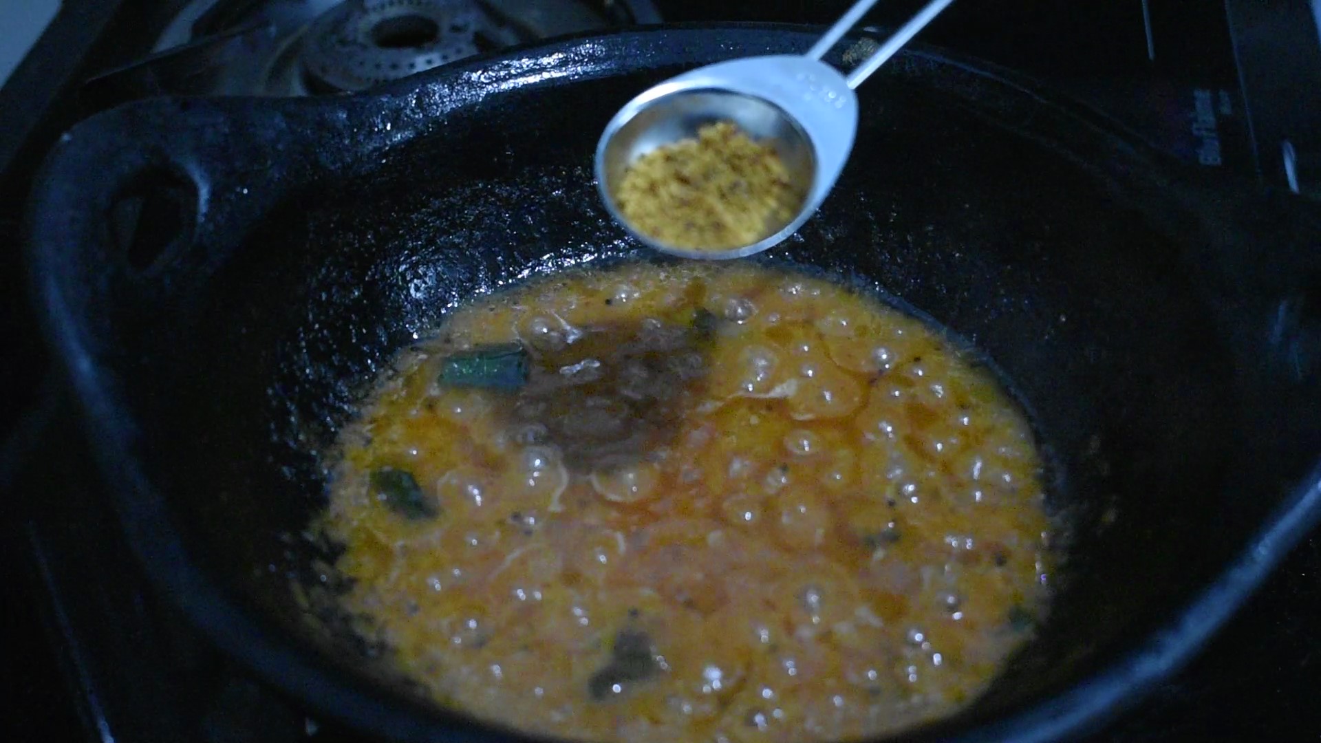 Add 100 ml of oil to a kadai in medium flame. When the oil heats up add mustard seeds, fengreek seeds, curry leaves, asafoetida powder and the ground paste and stir well. Add salt according to your taste. Close and cook for 7-10 mins in medium flame.