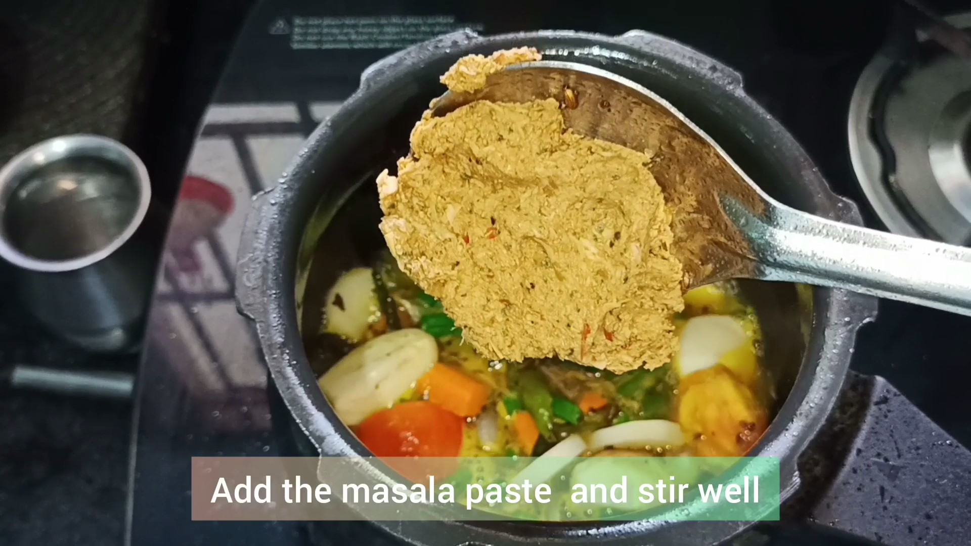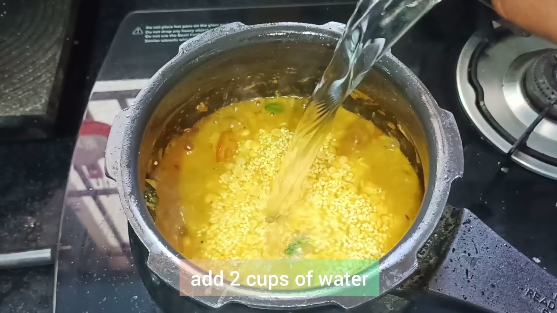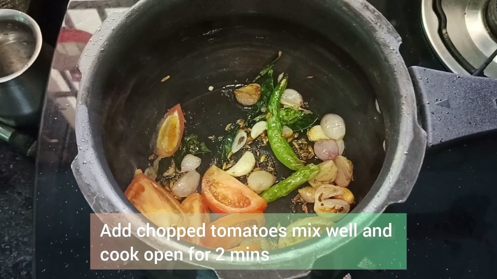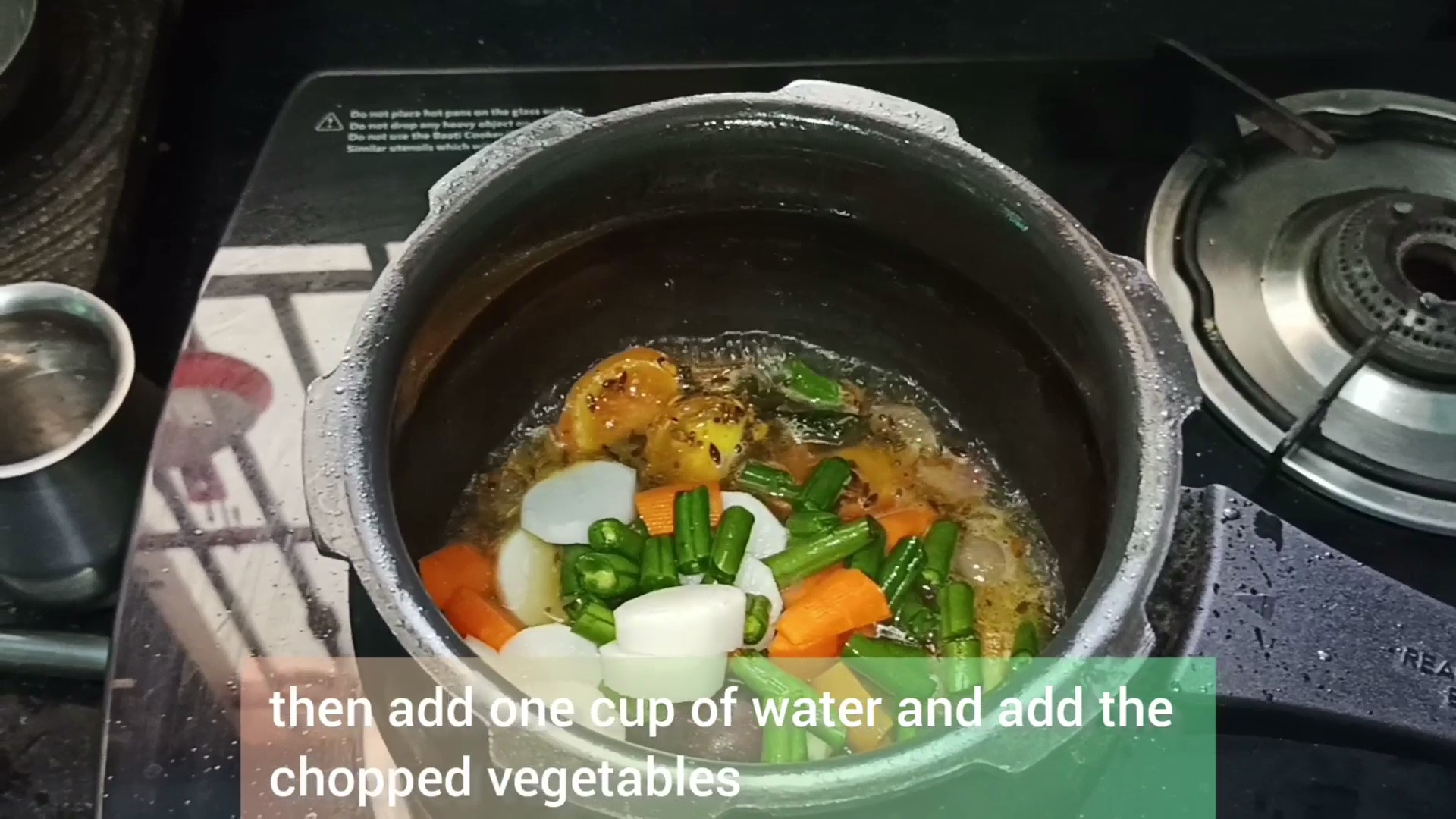 Add the chopped tomatoes and cook open for 2 mins. When the tomatoes are cooked half add 1 cup of water and add the chopped vegetables.