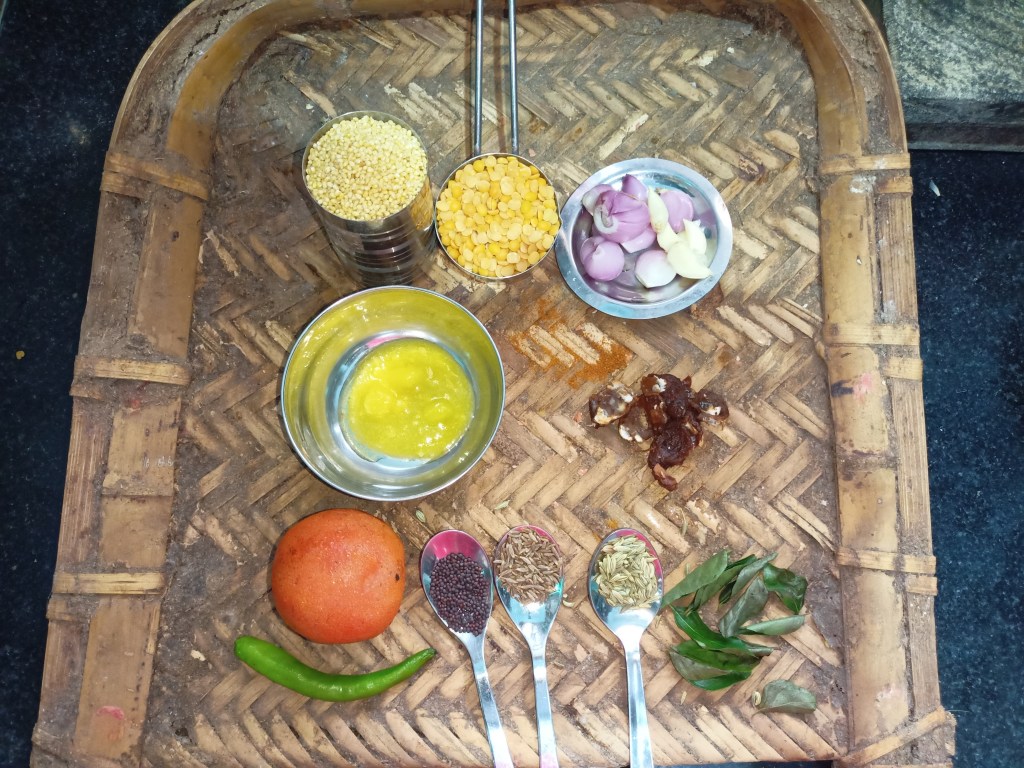 Soak the millet and dal for 30 mins. Soak the tamarind in 60 ml of water and extract the juice.
