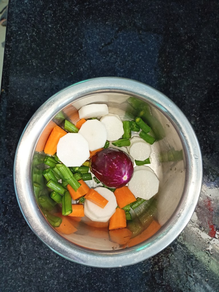 I have used a bowl of veggies containing carrot, beans, brinjal and raddish. You can use any vegetables of choice. I had grossly cut the vegetables.