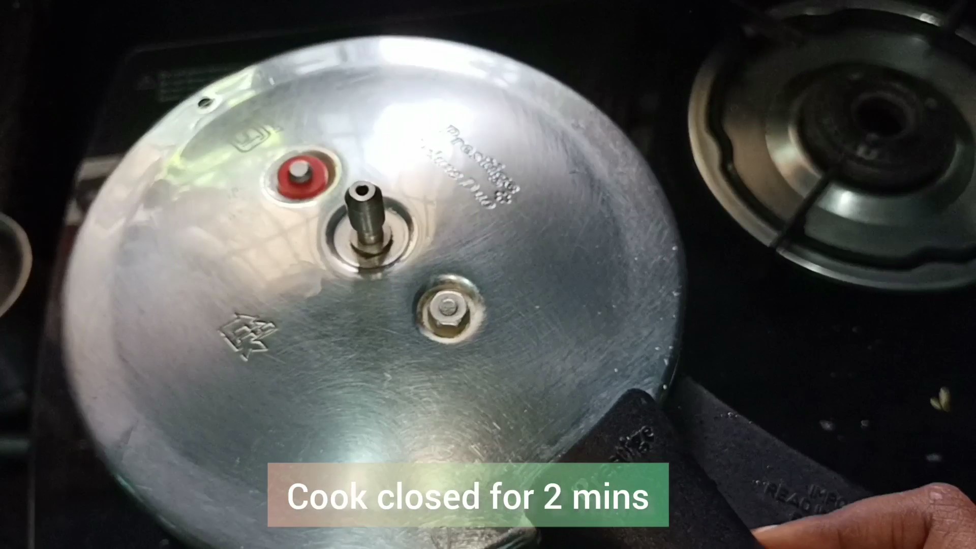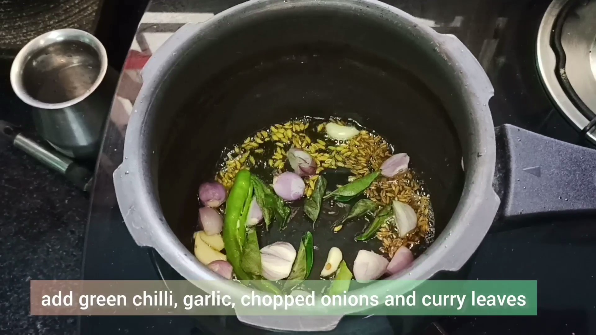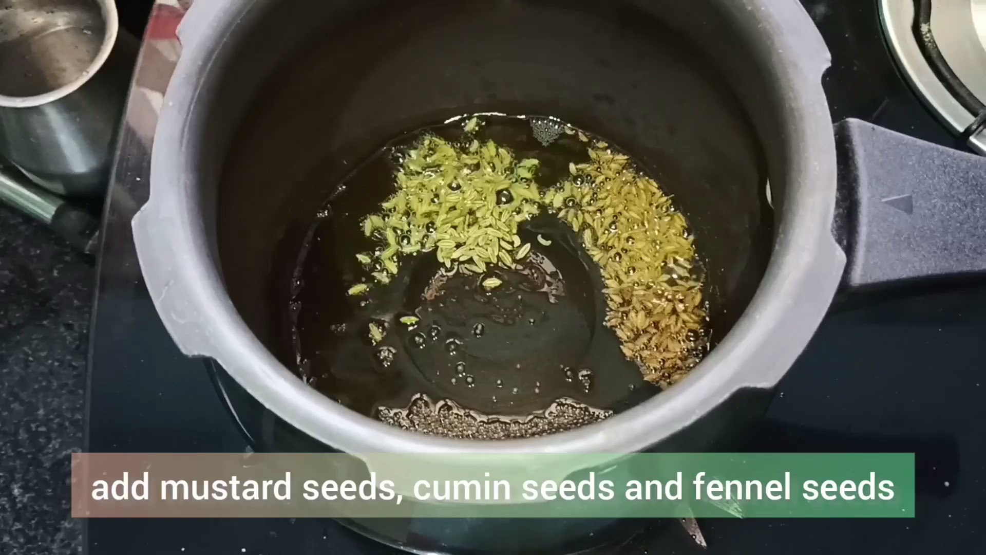 Keep a pressure cooker in medium flame and add 2 tsp ghee. Oil can also be used but ghee gives a nice aroma. When the Ghee gets heated up add mustard seeds, wait for the mustard seeds to splutter then add cumin seeds, fennel seeds, green chilli, garlic cloves , Shallots chopped, curry leaves and asafoetida powder. Give a gentle mix and wait for the onions to turn golden brown in color