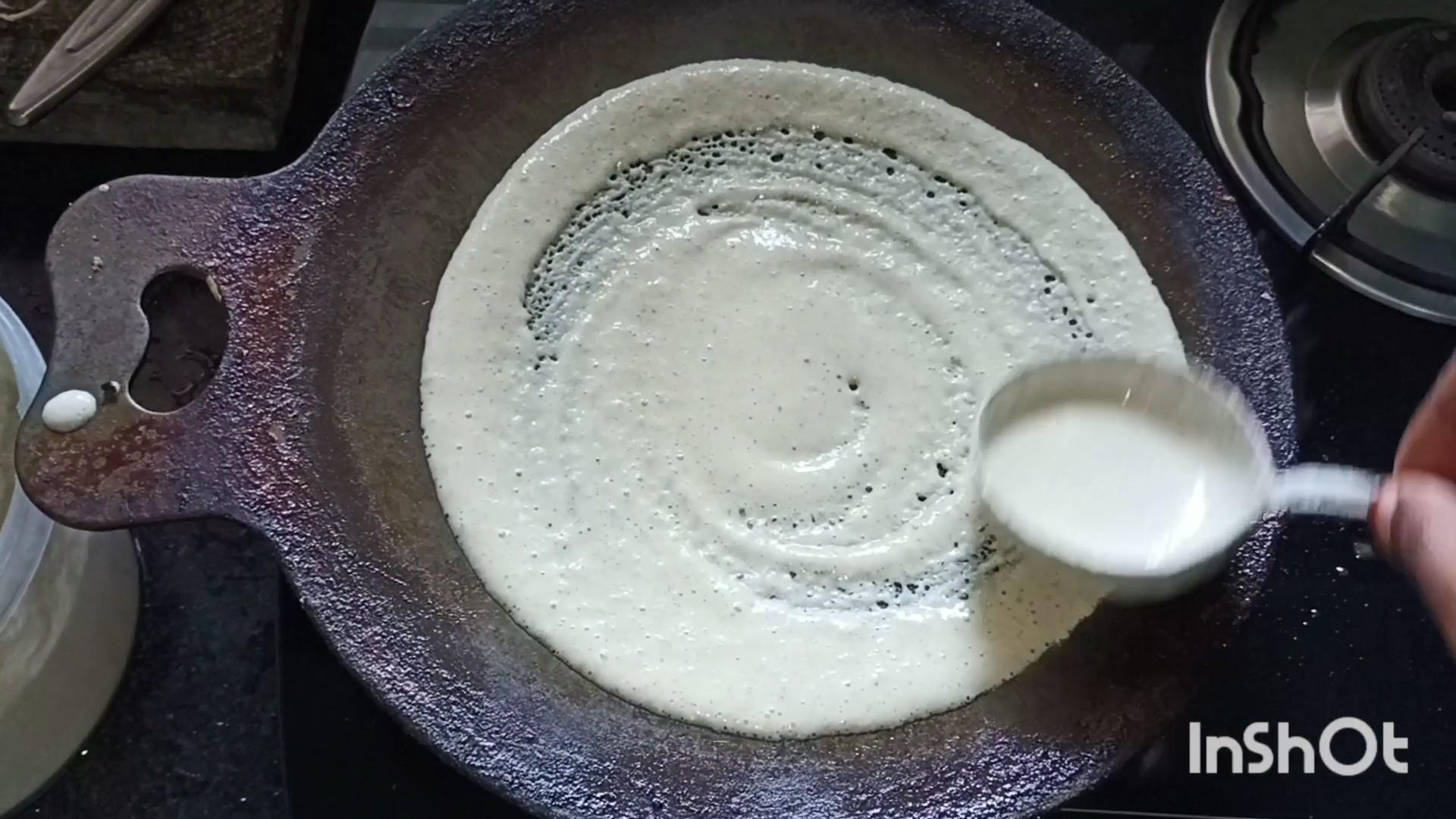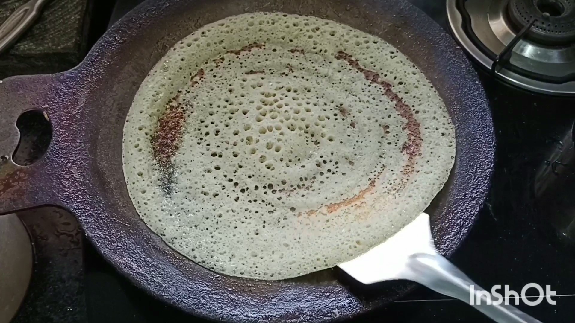 Heat a dosa pan in medium flame. Once the pan is heated up pour a laddle full of batter and drizzle oil on the sides. When the dosa turns golden brown flip the dosa to the other side. If you try to flip the dosa when soft it tears up, so wait for the dosa to be cooked on one side. Serve the dosa hot with chuney or sambar.