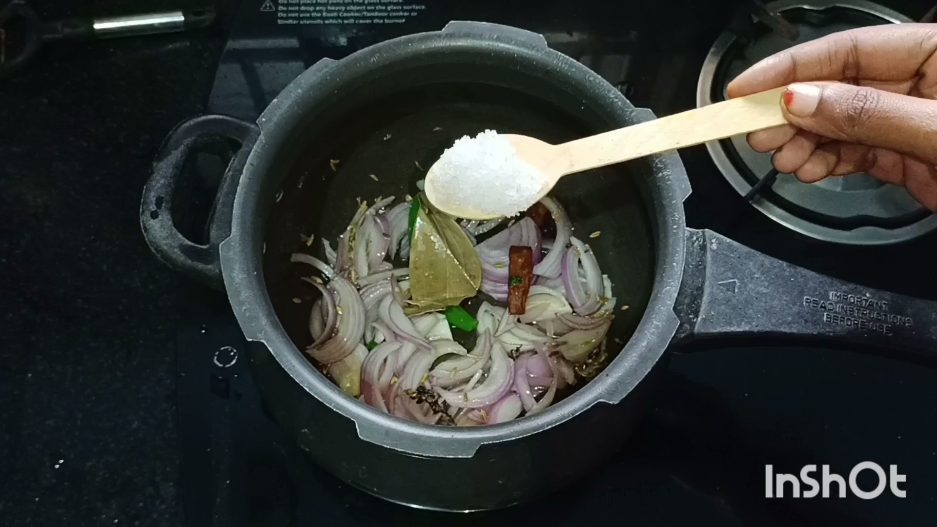 Keep a pressure cooker in medium flame and add 4 tsp of ghee. Add all the spices ( bay leaf, cinnamon, cloves, star anise, fennel seeds, mace and black stone flower). Gently fry for 1 min and add the onions and ginger garlic paste. Add 1 tsp rock salt to cook the onions till you get the golden brown colour. Stir occasionally since the ginger garlic paste may stick to the vessel.