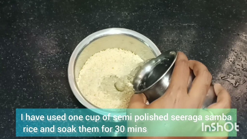 Clean and soak the seeraga samba rice in water for 30 mins. Since I have used the semi polished variety it may look light brown in colour.