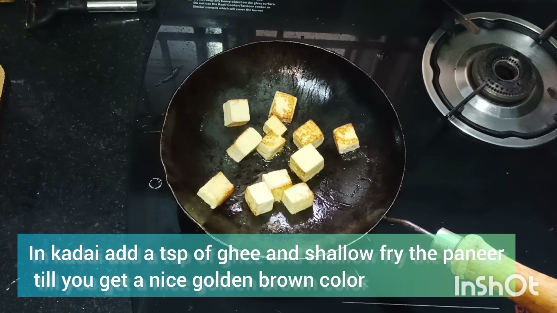 Dice the paneer into cubes. In a kadai add a little ghee and sauté the paneer till you get a nice golden brown colour.